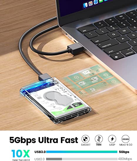 - SuperSpeed USB 3.0 with UASP – The SATA interface of the 2.5 ssd enclosure supports UASP SATA III transmission protocol, which is 70% faster than traditional USB3.0. The maximum data transfer rate of the USB 3.0 interface is 5Gbps. Backward compatible with USB 2.0 or 1.1 ports.